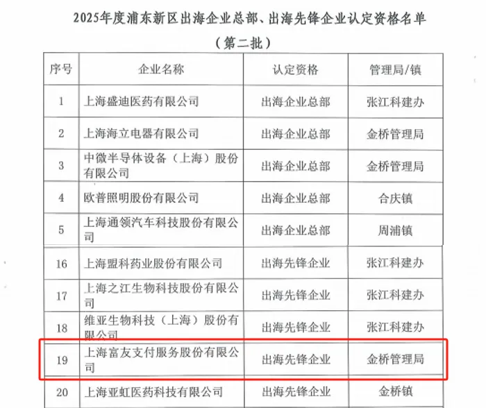 全球化业务布局获认证!富友支付获批浦东新区“出海先锋企业”